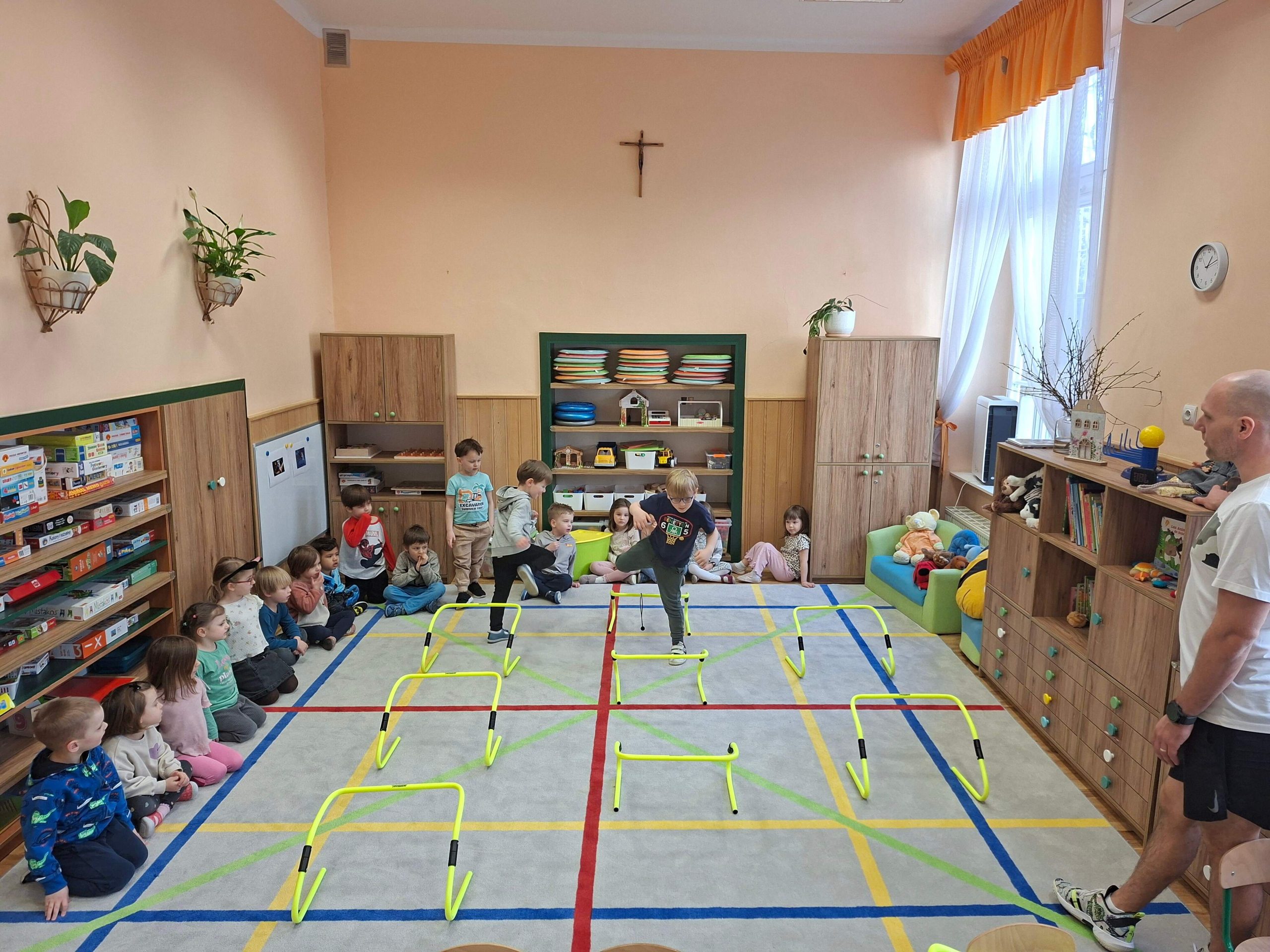 Zajęcia z rytmiki odbywają się raz w tygodniu. Prowadzi je pan Artur, absolwent naszego Przedszkola, nauczyciel wychowania muzycznego. Zajęcia są prowadzone